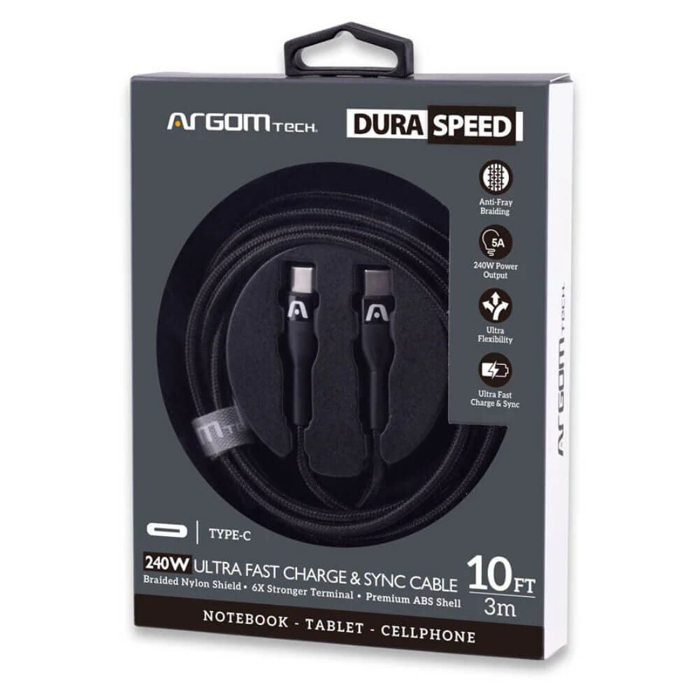 CABLE ARGOM ARG-CB-0074BK DURA SPEED 240W PD FAST CHRG TYPE-C TO TYPE-C NYLON BRAIDED 3M/10FT BLACK