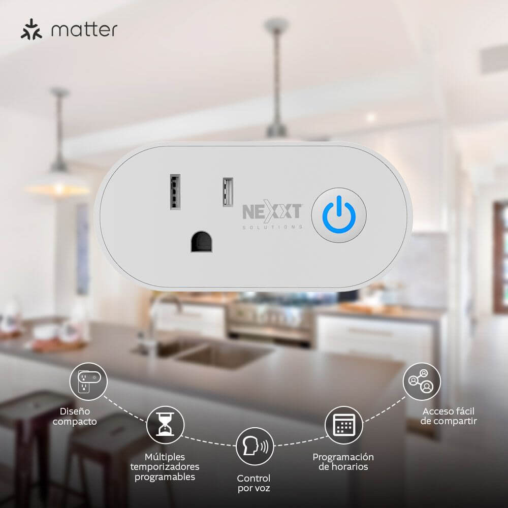- Funcionalidades *Control remoto de encendido/apagado. * Creación de horarios y temporizadores programables. * Interacción con otros dispositivos inteligentes de Nexxt Home. * Diseño compacto. * Protección contra